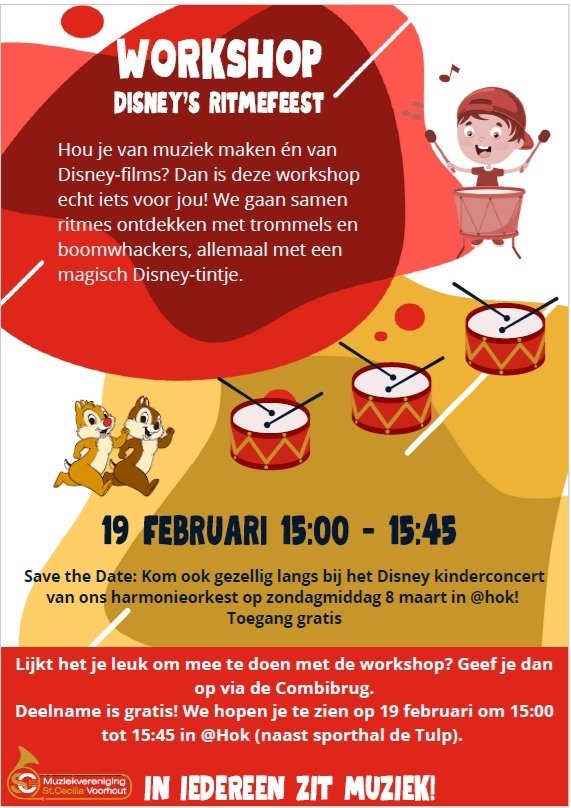 Hou je van muziek maken én van Disney-films? Dan is deze workshop echt iets voor jou! We gaan samen ritmes ontdekken met trommels en boomwhackers, allemaal met een magisch Disney-tintje. Voor kinderen uit groep 3, 4 en 5 (leeftijd ong. van 6 t/m 9 jaar).